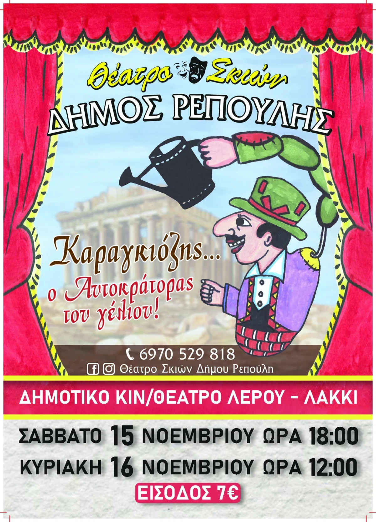 Το αγαπημένο Θέατρο Σκιών του Δήμου Ρεπούλη έρχεται για πρώτη φορά στη Λέρο για να παρουσιάσει μια ξεκαρδιστική κωμωδία από τα (ουκ ολίγα) κατορθώματα του γνωστού και λαοφιλούς Καραγκιόζη!