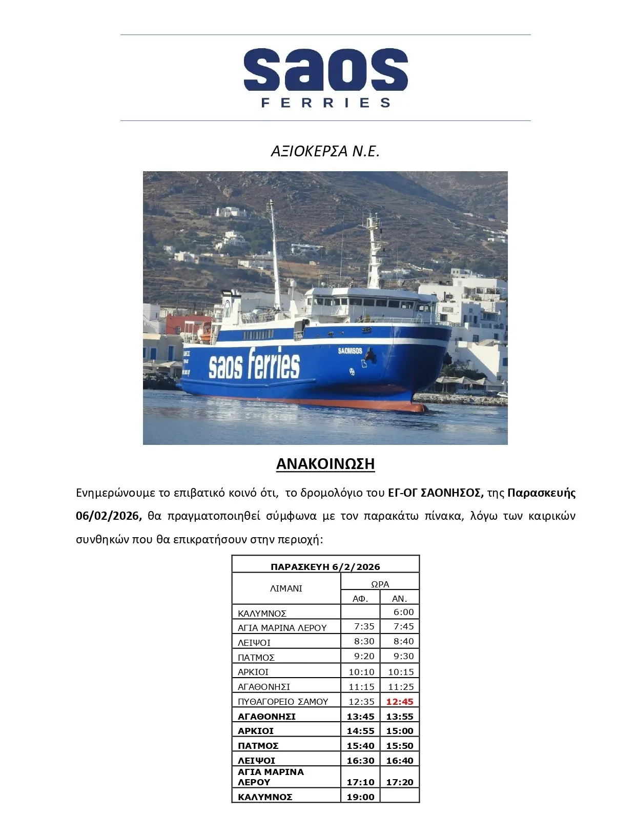 Η SAOS Ferries ενημερώνει το επιβατικό κοινό ότι το δρομολόγιο του Ε/Γ-Ο/Γ πλοίου «ΣΑΟΝΗΣΟΣ», που ήταν προγραμματισμένο για την Παρασκευή 06/02/2026, θα πραγματοποιηθεί με τροποποιημένο πρόγραμμα, λόγω των καιρικών συνθηκών που θα επικρατήσουν στην περιοχή.