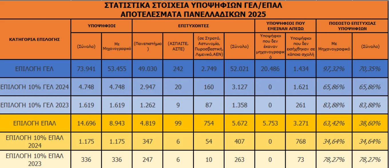 Σε 70.276 ανήλθε ο συνολικός αριθμός των φετινών υποψηφίων, από τους οποίους οι 59.822 ήταν υποψήφιοι των ΓΕΛ και οι 10.454 υποψήφιοι των ΕΠΑΛ.