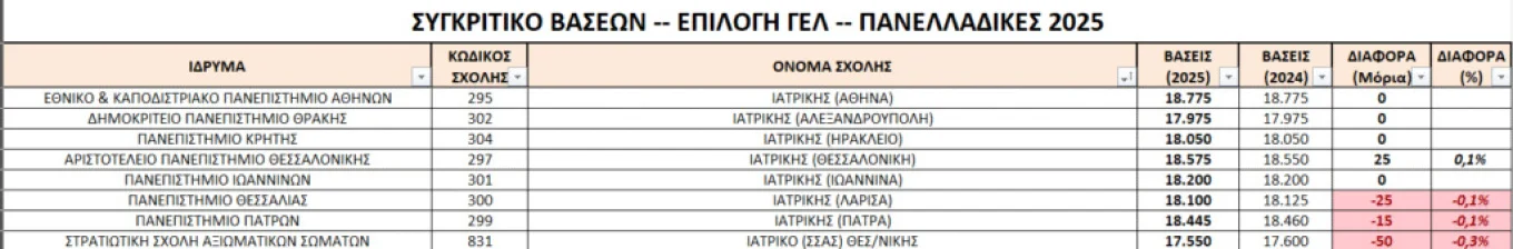 Οι βάσεις στις Ιατρικές Σχολές παραμένουν σχεδόν αμετάβλητες: +25 μόρια η Θεσσαλονίκη – 25 μόρια η Λάρισα, -15 μόρια η Πάτρα – 50 μόρια η ΣΣΑΣ. Χωρίς μεταβολές οι υπόλοιπες.