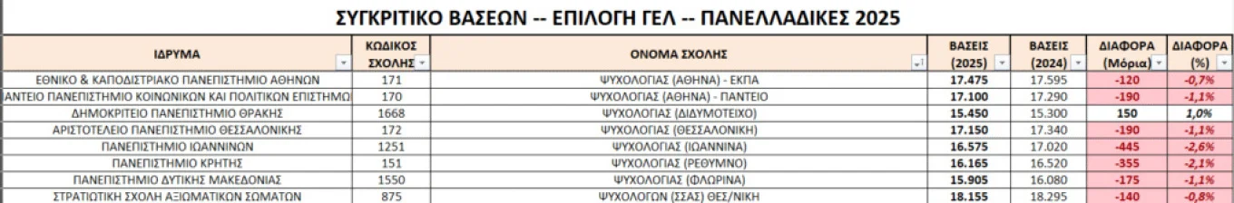 Στις Ψυχολογίες, σημειώθηκε πτώση βάσεων από 120 έως 445 μόρια με εξαίρεση την Ψυχολογία Διδυμοτείχου που ανέβηκε 150 μόρια.
