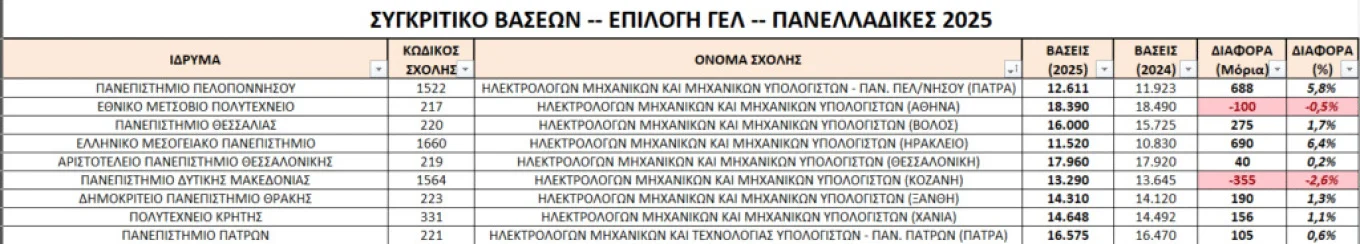 Στις Σχολές Ηλεκτρολόγων Μηχανικών, διαπιστώνεται πτώση 100 μόρια για την Αθήνα και 355 μόρια για την Κοζάνη ενώ αύξηση στις υπόλοιπες, από 40 μόρια έως και 688 μόρια.