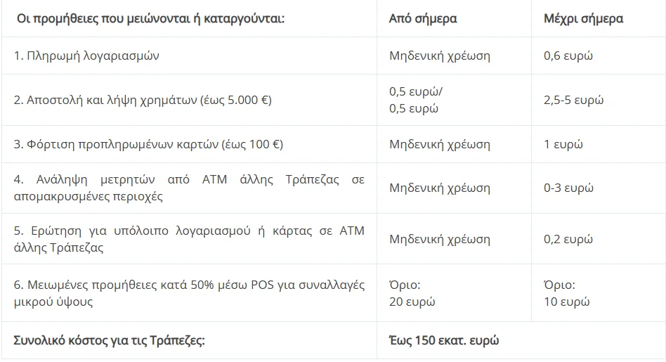 - Mηδενικές χρεώσεις για ανάληψη μετρητών σε δημοτικές ενότητες όπου υπάρχει ΑΤΜ μόνο ενός τραπεζικού ιδρύματος. Σημειώνεται ότι σήμερα οι αντίστοιχες χρεώσεις ανέρχονται από 0-3 ευρώ ανά συναλλαγή.
