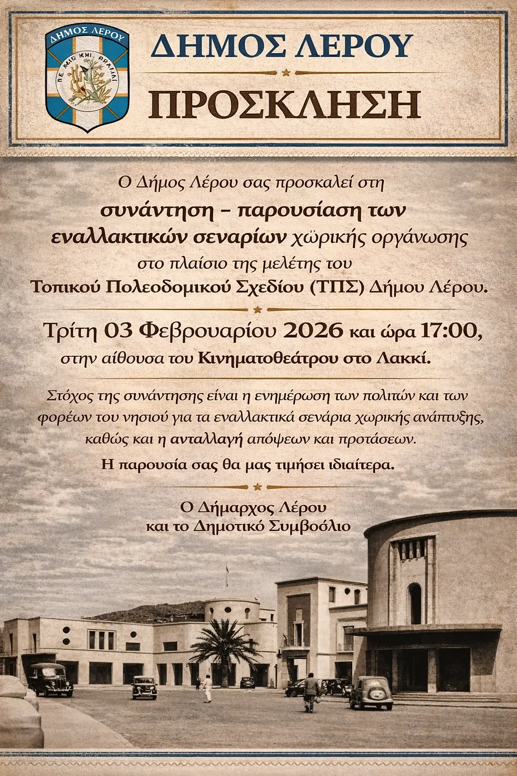 Ο Δήμος Λέρου προσκαλεί τους πολίτες και τους φορείς του νησιού στη συνάντηση – παρουσίαση των εναλλακτικών σεναρίων χωρικής οργάνωσης, στο πλαίσιο της μελέτης του Τοπικού Πολεοδομικού Σχεδίου (ΤΠΣ) Δήμου Λέρου.