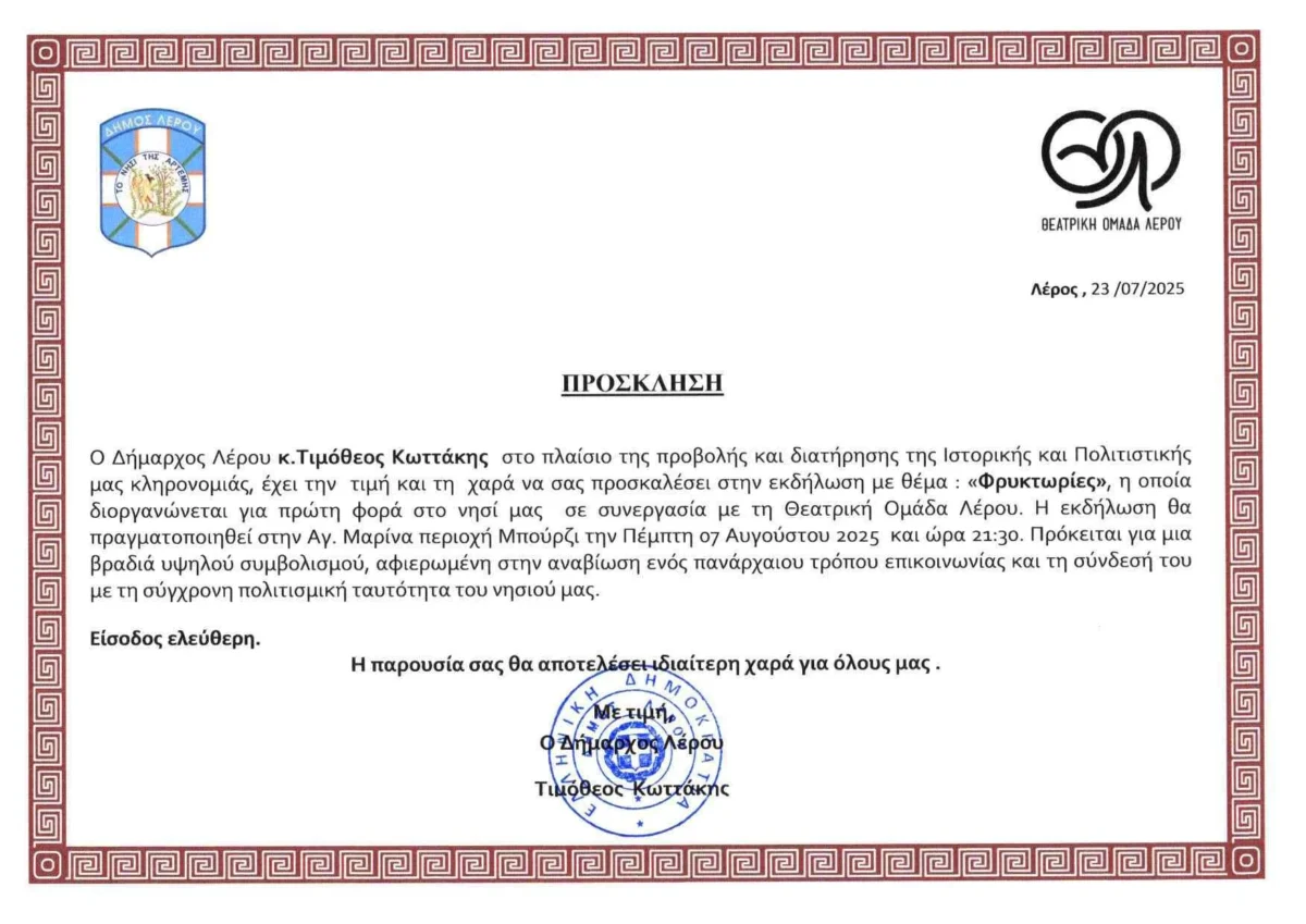 Ο Δήμος Λέρου σε συνεργασία με την Θεατρική Ομάδα Λέρου, την Πέμπτη 07 Αυγούστου και ώρα 9.30μ.μ. πλησίον του Μπουρτζίου, στην αυλή του Αλευρόμυλου, θα παρουσιάσουν για πρώτη φορά εκδήλωση με θέμα τις φρυκτωρίες του νησιού μας από την εποχή του Ομήρου.