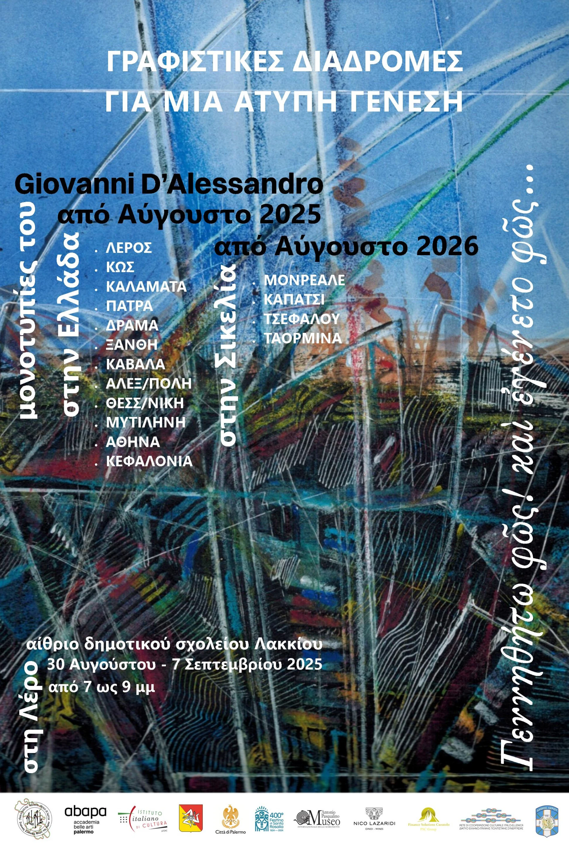 Με πρωτοβουλία του Πολιτιστικού Σωματείου AIAL Λέρου και με την υποστήριξη της Ακαδημίας Καλών Τεχνών του Παλέρμο, εγκαινιάζεται στη Λέρο το Σάββατο 30 Αυγούστου 2025 και ώρα 19:00, στο αίθριο του Δημοτικού Σχολείου Λακκίου, η περιοδεία στην Ελλάδα και στη Σικελία μίας έκθεσης αφιερωμένης στην άτυπη τέχνη του Giovanni D’Alessandro.