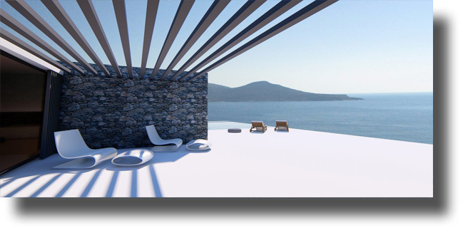 Τα περιμετρικά τοιχία της κατοικίας από εμφανή οπλισμένο σανιδωτό μπετόν θα εκτείνονται έξω από τα όρια της, παίζοντας το ρόλο του ανεμοφράκτη προστατεύοντας τις ημέρες που φυσάει.