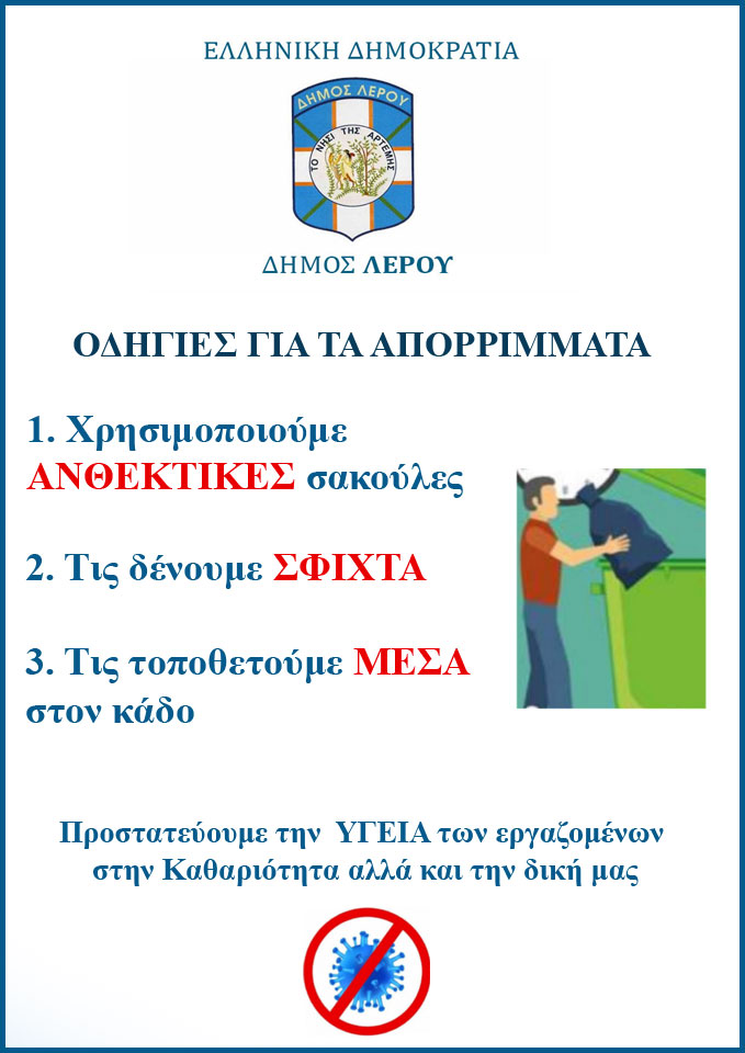 Ο Δήμος Λέρου ενημερώνει τους πολίτες για τον ασφαλέστερο τρόπο διαχείρισης των απορριμμάτων την περίοδο της κρίσης με τον κορονοϊό.
