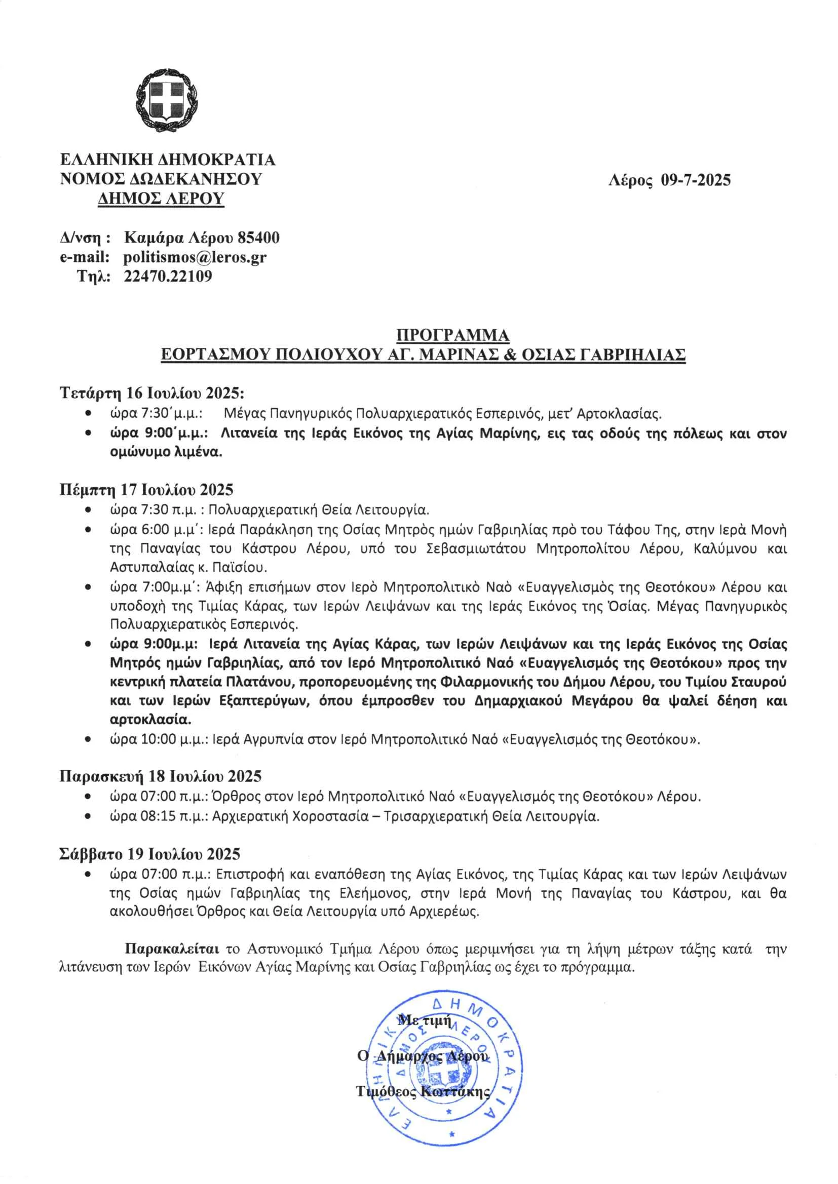 Από τον Δήμο Λέρου καταρτίστηκε το πρόγραμμα Εορτασμού Πολιούχου Αγ. Μαρίνας και Οσίας Γαβριηλίας (16 – 19 Ιουλίου 2025), όπως παρακάτω:
