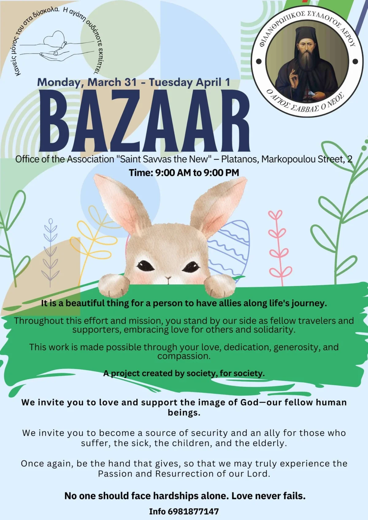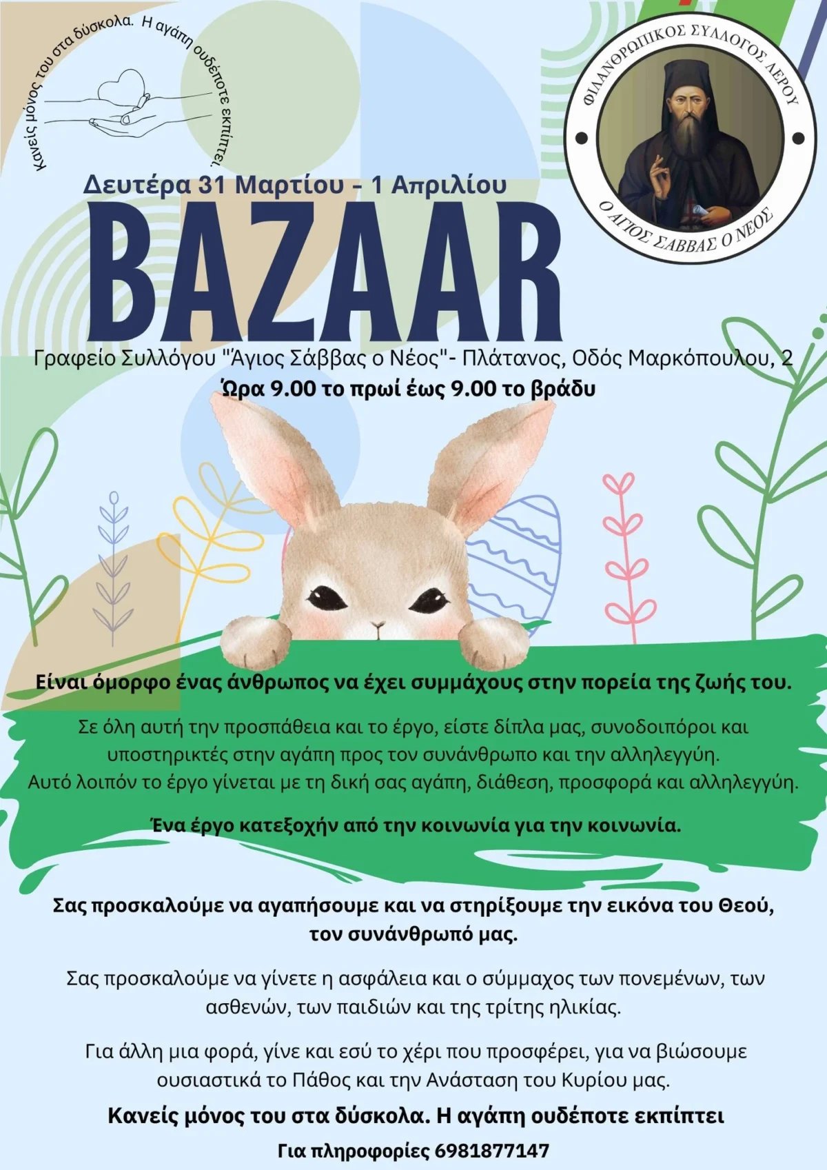 - Δευτέρα 31 Μαρτίου έναρξη Πασχαλινό παζάρι του συλλόγου στο γραφείο στον Πλάτανο Λέρου 9 το πρωί με 9 το βράδυ