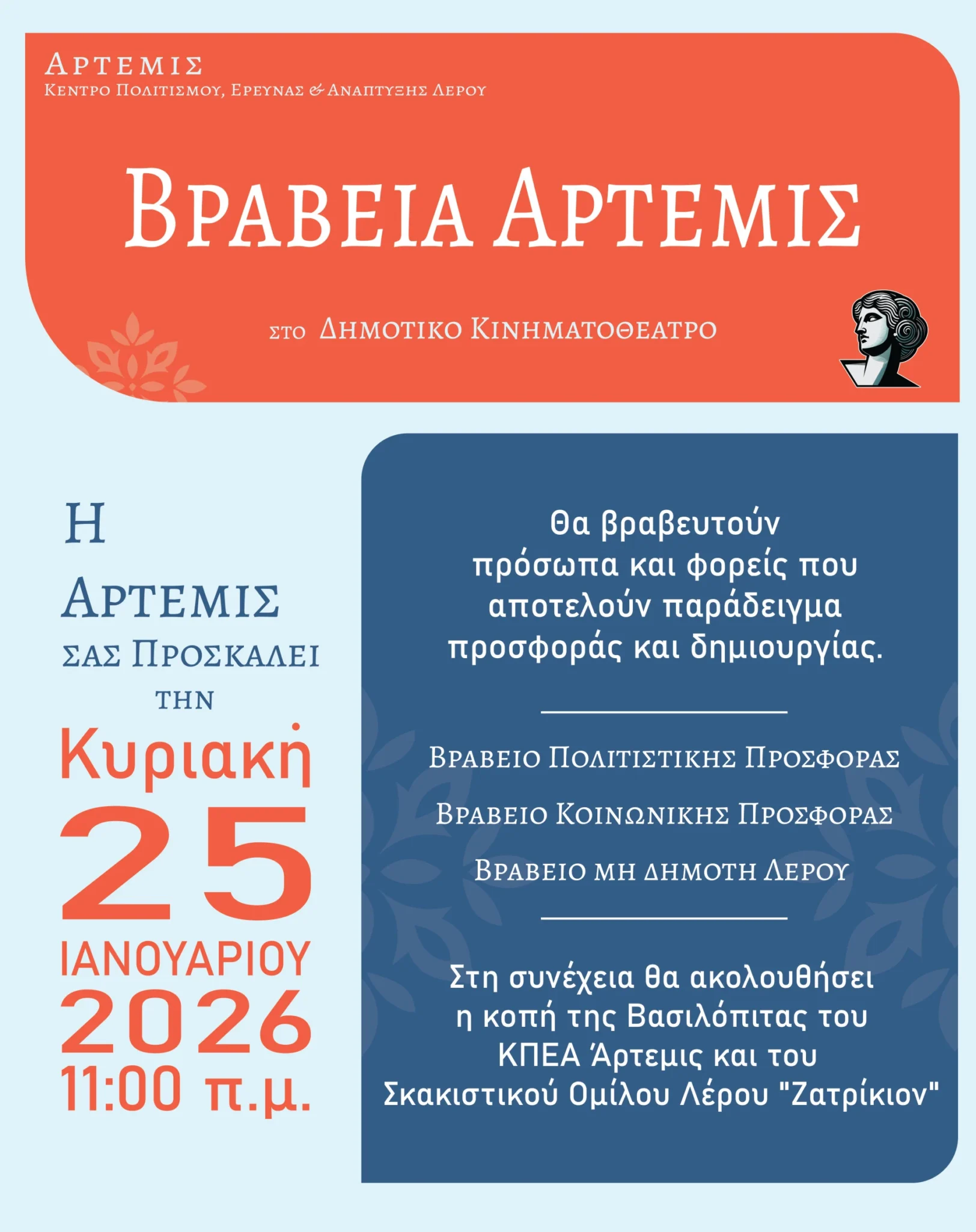 Το Κέντρο Πολιτισμού Έρευνας και Ανάπτυξης Λέρου Άρτεμις έχει τη χαρά και την τιμή να σας προσκαλέσει την Κυριακή 25 Ιανουαρίου 2026 και ώρα 11:00 π.μ. στην εκδήλωση απονομής των Βραβείων Άρτεμις, η οποία θα πραγματοποιηθεί στο Δημοτικό Κινηματοθέατρο Λέρου.