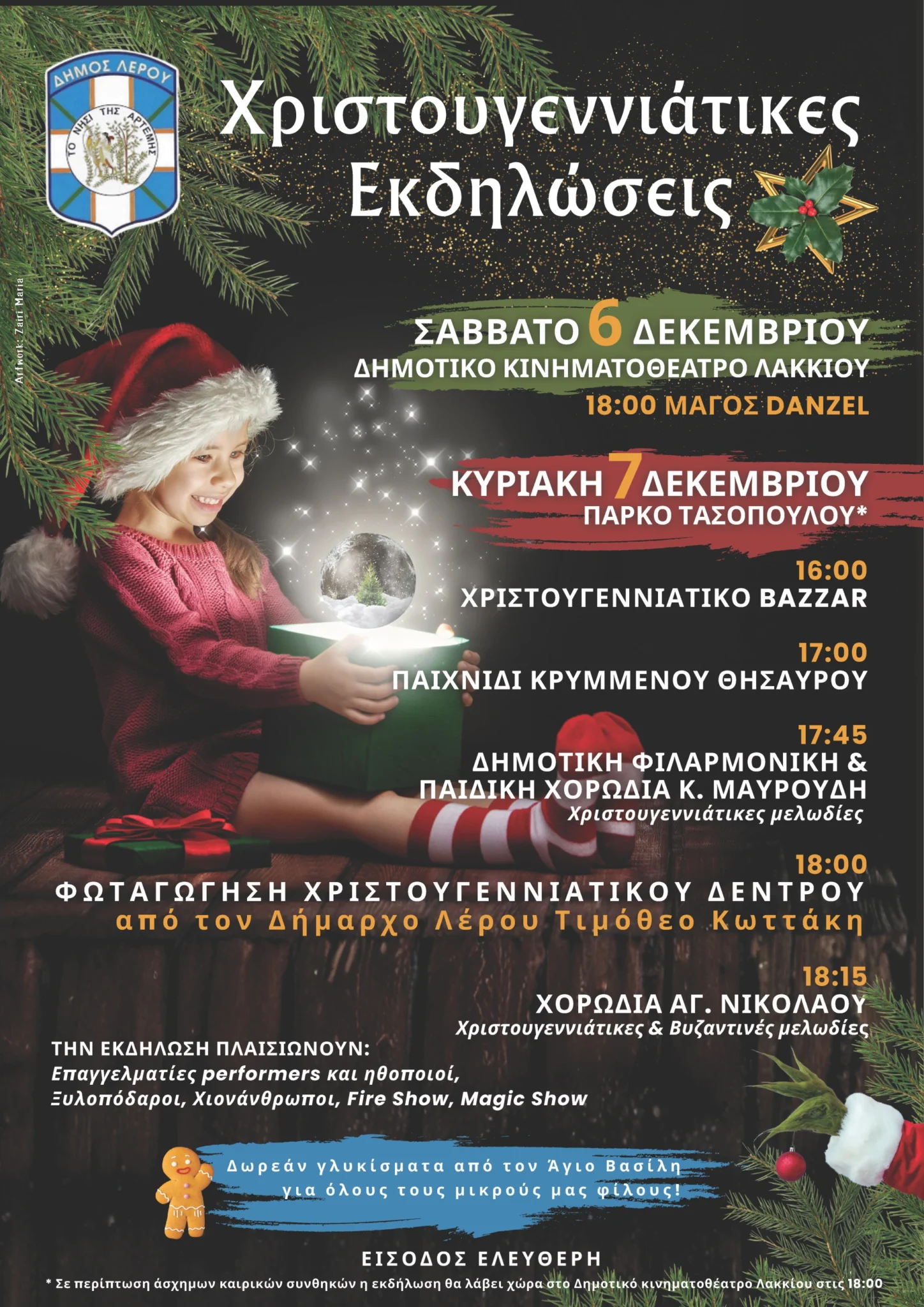 Ο Δήμος Λέρου ανακοίνωσε το πρόγραμμα των φετινών χριστουγεννιάτικων εκδηλώσεων, που θα πραγματοποιηθούν το Σάββατο 6 και την Κυριακή 7 Δεκεμβρίου 2025.