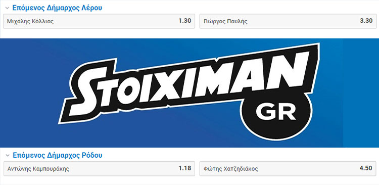 Η εταιρεία επίσης προεξοφλεί νίκη του υποψηφίου Δημάρχου Ρόδου κ. Αντώνη Καμπουράκη με απόδοση 1.18.