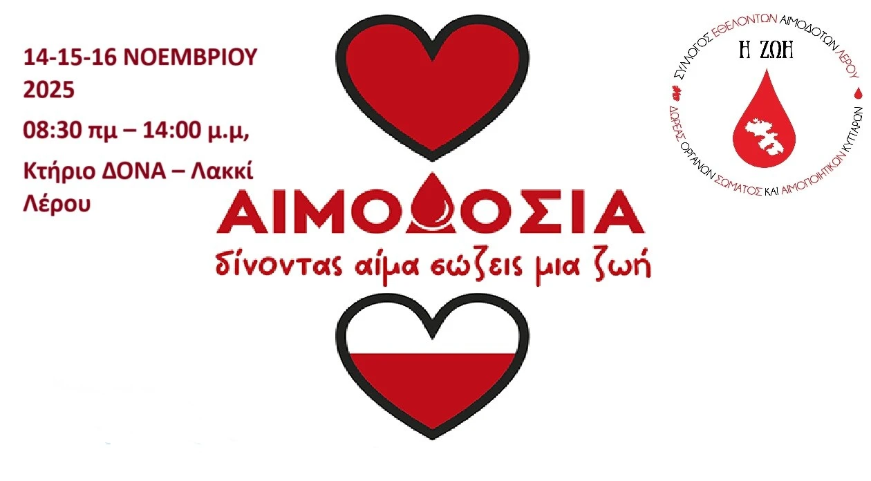 ΑΝΑΚΟΙΝΩΣΗ - Tο τρίτο και τελευταίο τριήμερο αιμοδοσίας του έτους 2025 θα πραγματοποιηθεί 14-15-16 Νοεμβρίου 2025 & ώρες 08:30 π.μ.- 14:00 μ.μ. στη Δημοτική Αίθουσα ΔΟΝΑ στο Λακκί!
