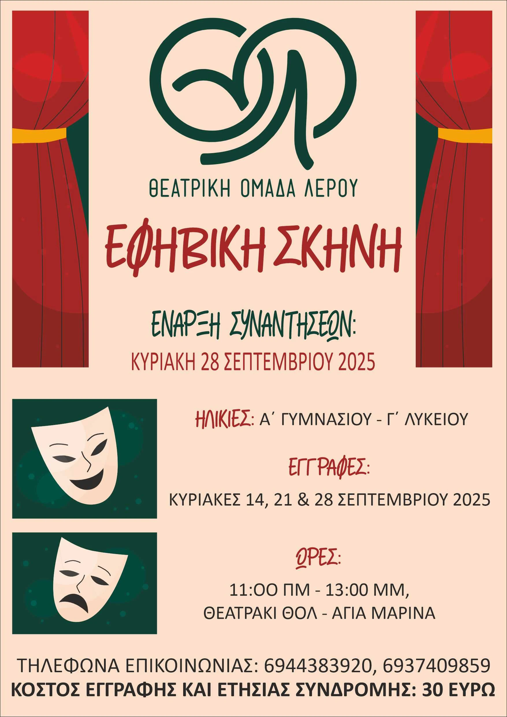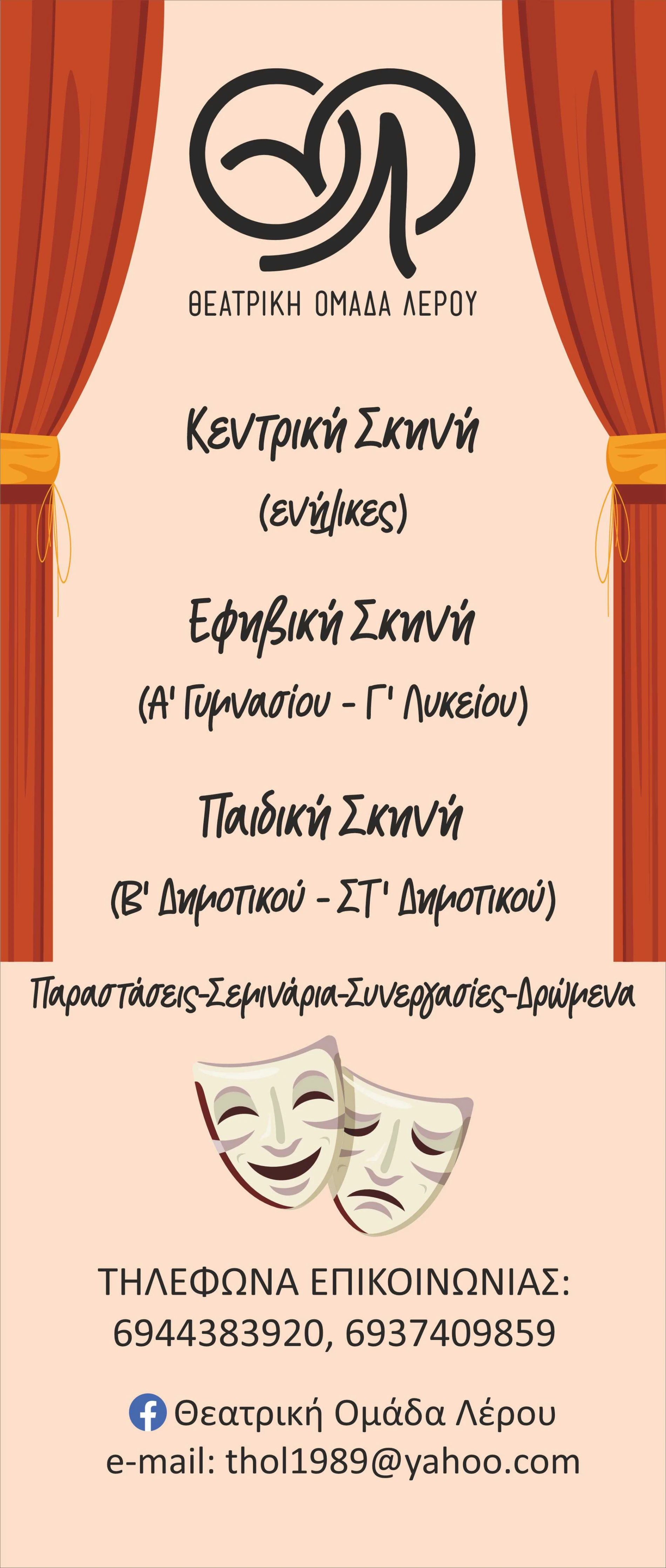 Η Θεατρική Ομάδα Λέρου ξεκινάει και φέτος τη δράση της, για 37η χρονιά, δυναμικά και δημιουργικά και καλεί μικρούς και μεγάλους να γίνουν μέλη της!Η Παιδική σκηνή και η Εφηβική σκηνή της Θεατρικής Ομάδας Λέρου ξεκινάει και φέτος!