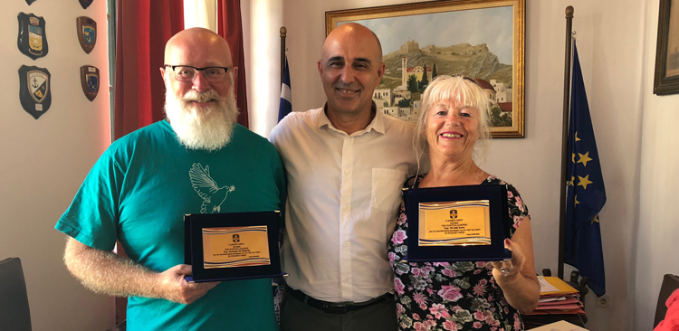 Ζευγάρι Δανών τουριστών που επισκέπτεται τη Λέρο τα τελευταία 25 χρόνια τιμήθηκε από τον Δήμαρχο Λέρου κ. Μιχάλη Κόλια ως ελάχιστη ένδειξη, της χαράς και της ικανοποίησης που δίνουν με το να επιλέγουν το νησί της Αρτέμιδος για να περάσουν τις διακοπές τους.