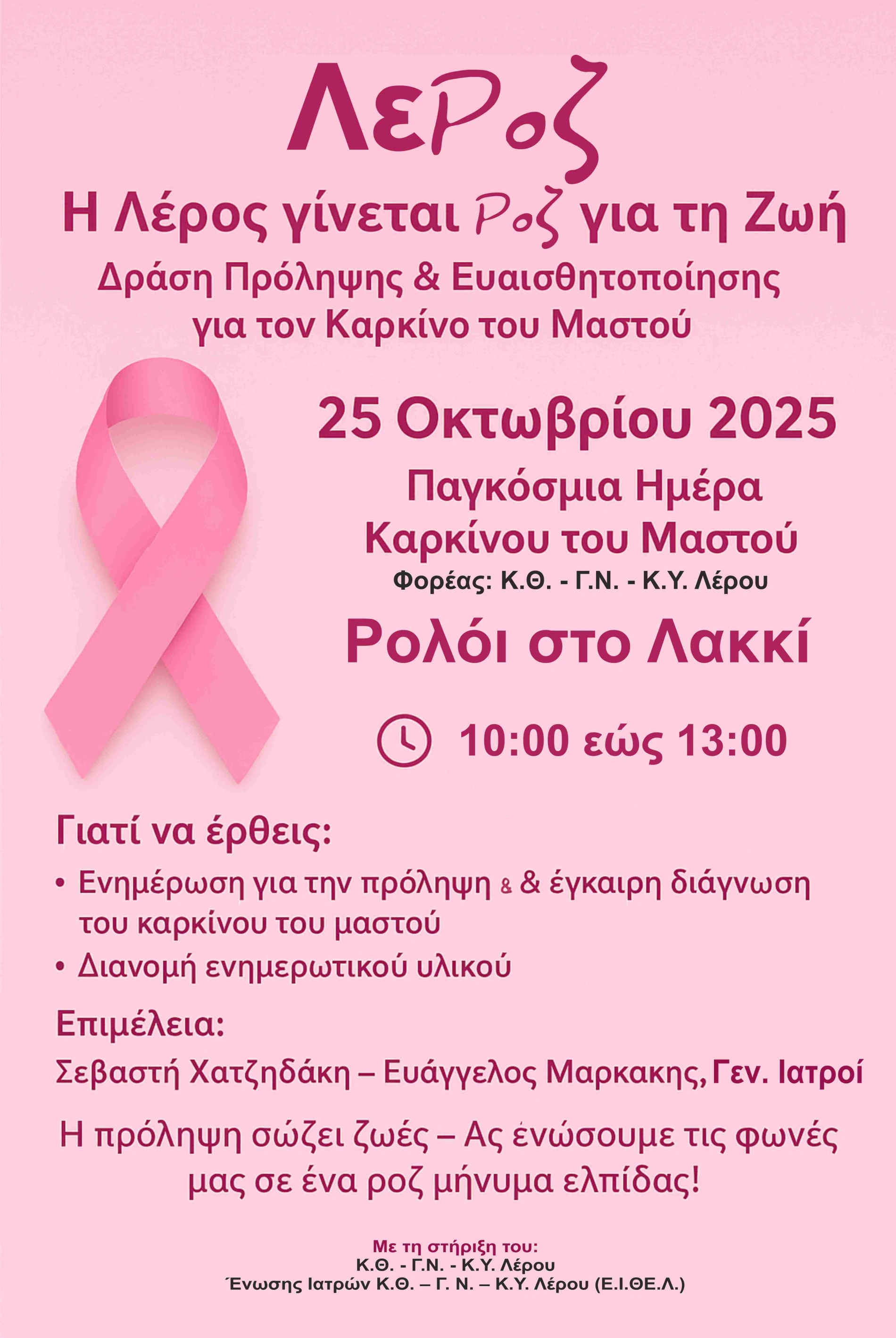 Η Λέρος «ντύνεται ροζ» και συμμετέχει ενεργά στην Παγκόσμια Ημέρα Καρκίνου του Μαστού (25 Οκτωβρίου), με μια πρωτοβουλία που στοχεύει στην ενημέρωση, ευαισθητοποίηση και πρόληψη.