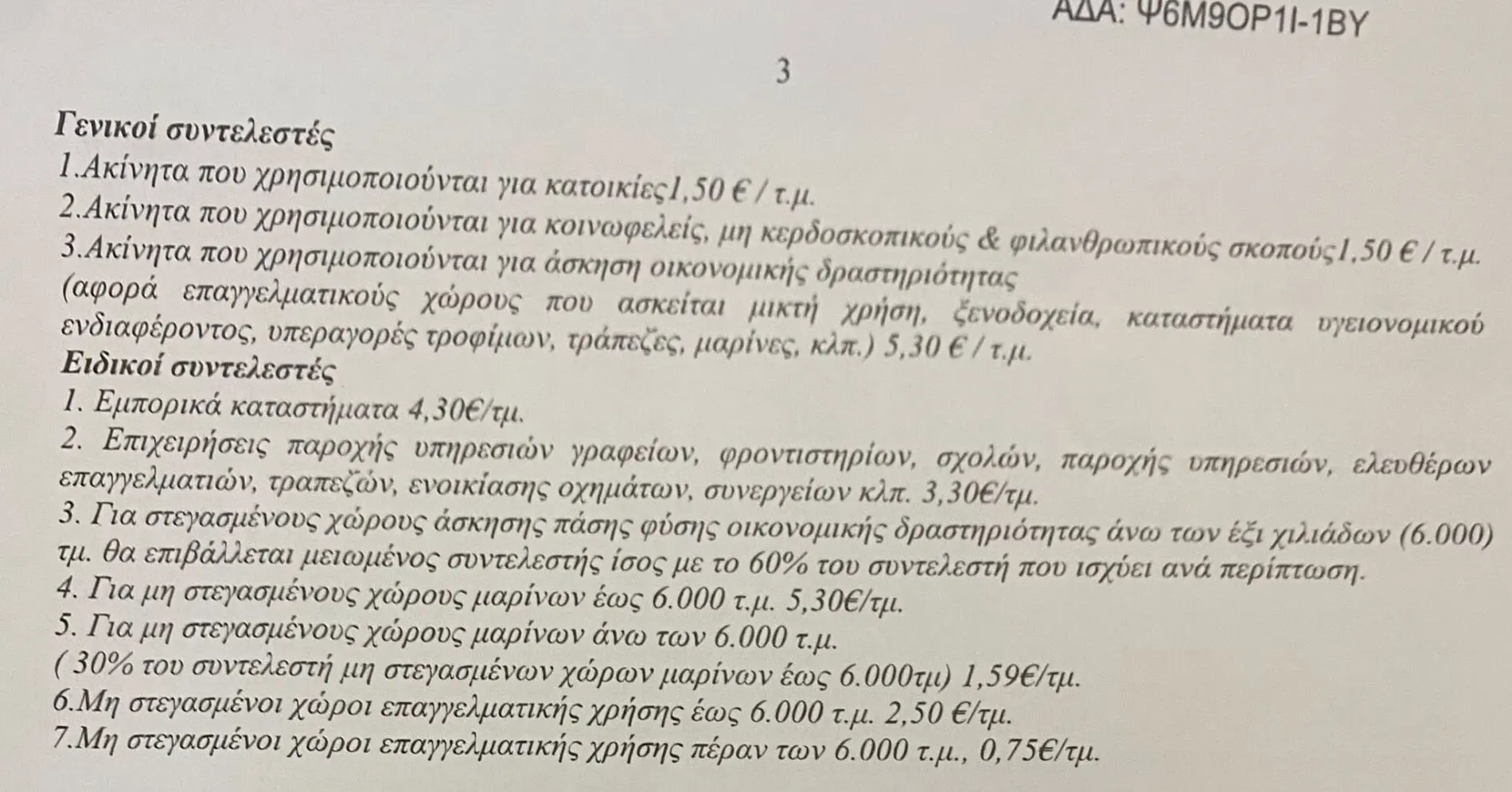 • Καταστήματα – ξενοδοχεία – επιχειρήσεις: από 3,20 €/τ.μ. σε 5,30 €/τ.μ.