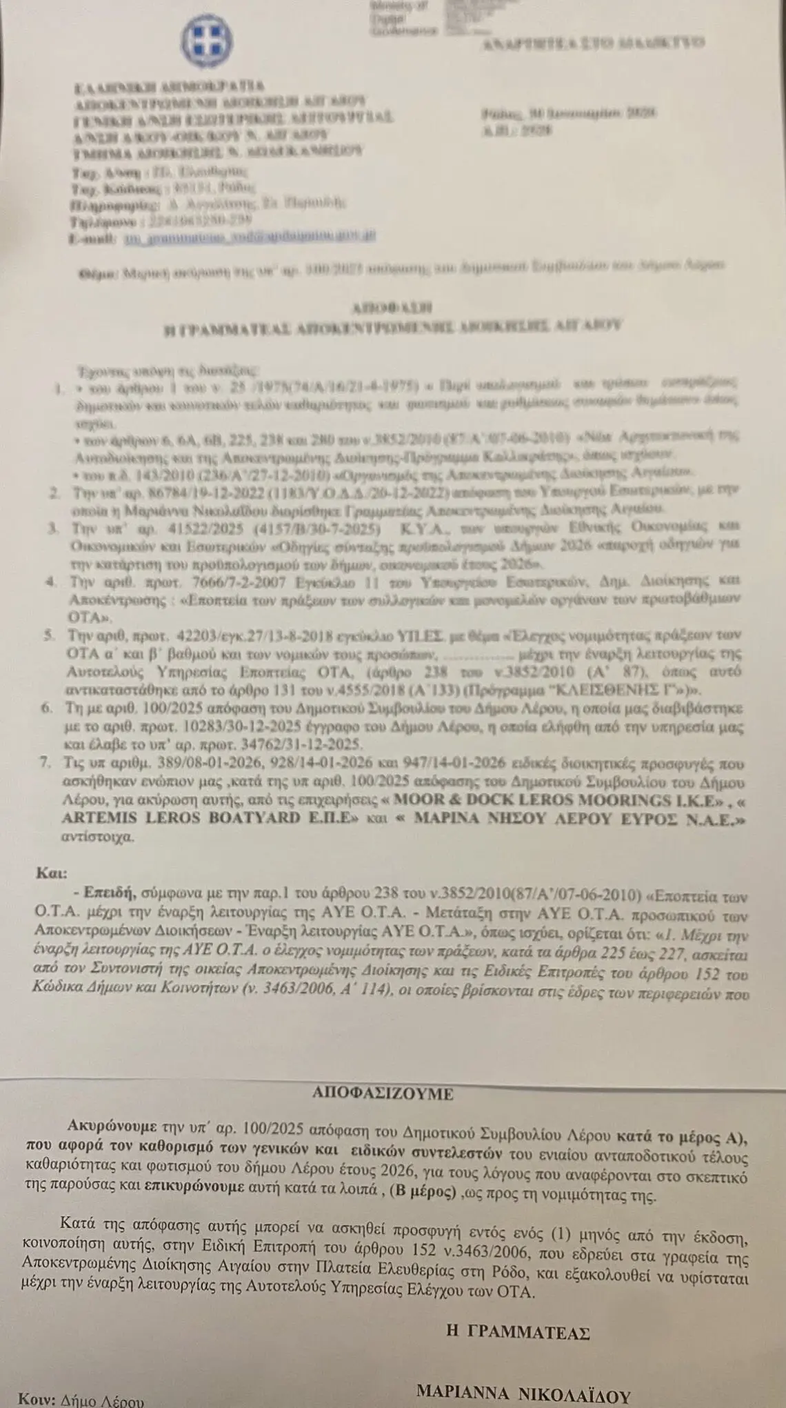 Με απόφαση της Γραμματέως της Αποκεντρωμένης Διοίκησης Αιγαίου, ακυρώνεται η υπ’ αριθμ. 100/2025 απόφαση του Δημοτικού Συμβουλίου, που αφορούσε τον καθορισμό των γενικών και ειδικών συντελεστών του ενιαίου ανταποδοτικού τέλους καθαριότητας και φωτισμού του Δήμου Λέρου για το έτος 2026.