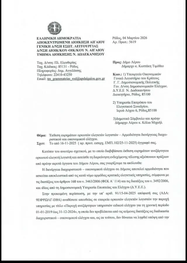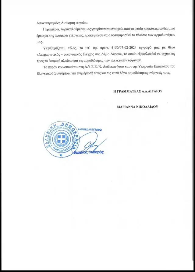 Υπενθυμίζεται, τέλος, το υπ’ αρ. πρωτ. 4150/07-02-2024 έγγραφό μας με θέμα «Διαχειριστικός – οικονομικός έλεγχος στο Δήμο Λέρου», το οποίο εξακολουθεί να ισχύει ως προς το θεσμικό πλαίσιο και τις αρμοδιότητες των ελεγκτικών οργάνων.