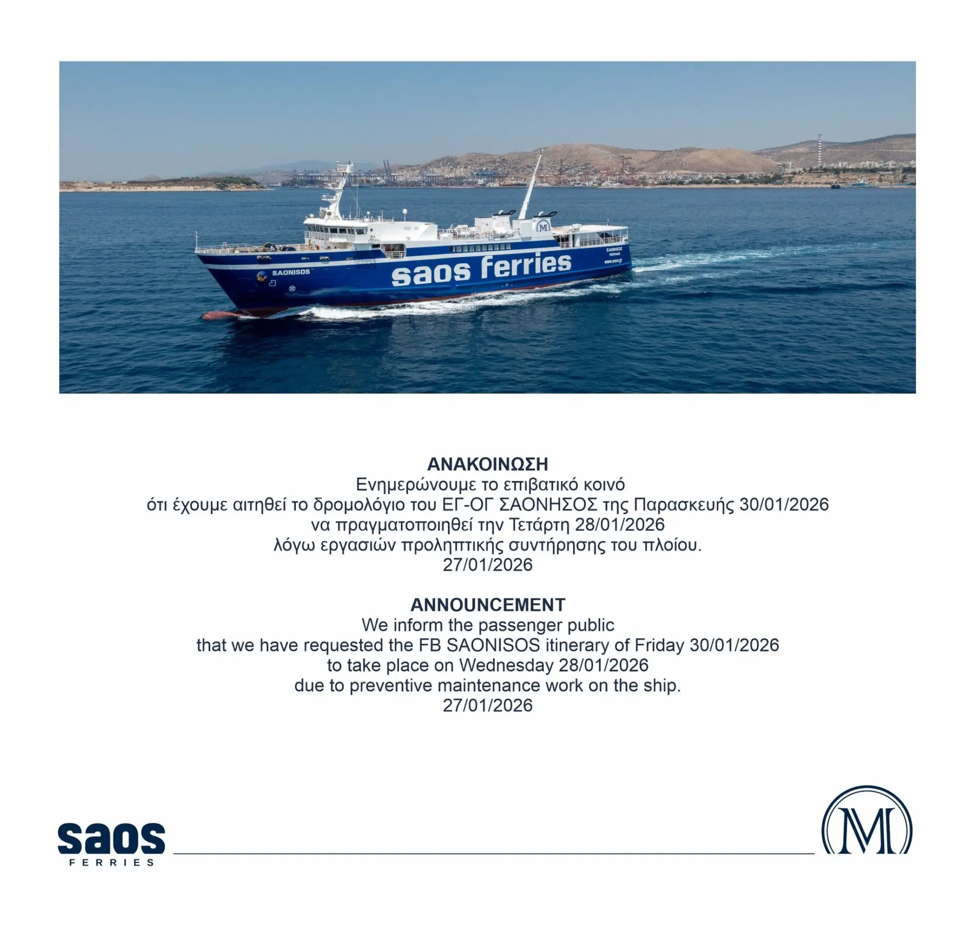 We inform the passenger public that we have requested the FB SAONISOS itinerary of Friday 30/01/2026 to take place on Wednesday 28/01/2026 due to preventive maintenance work on the ship.