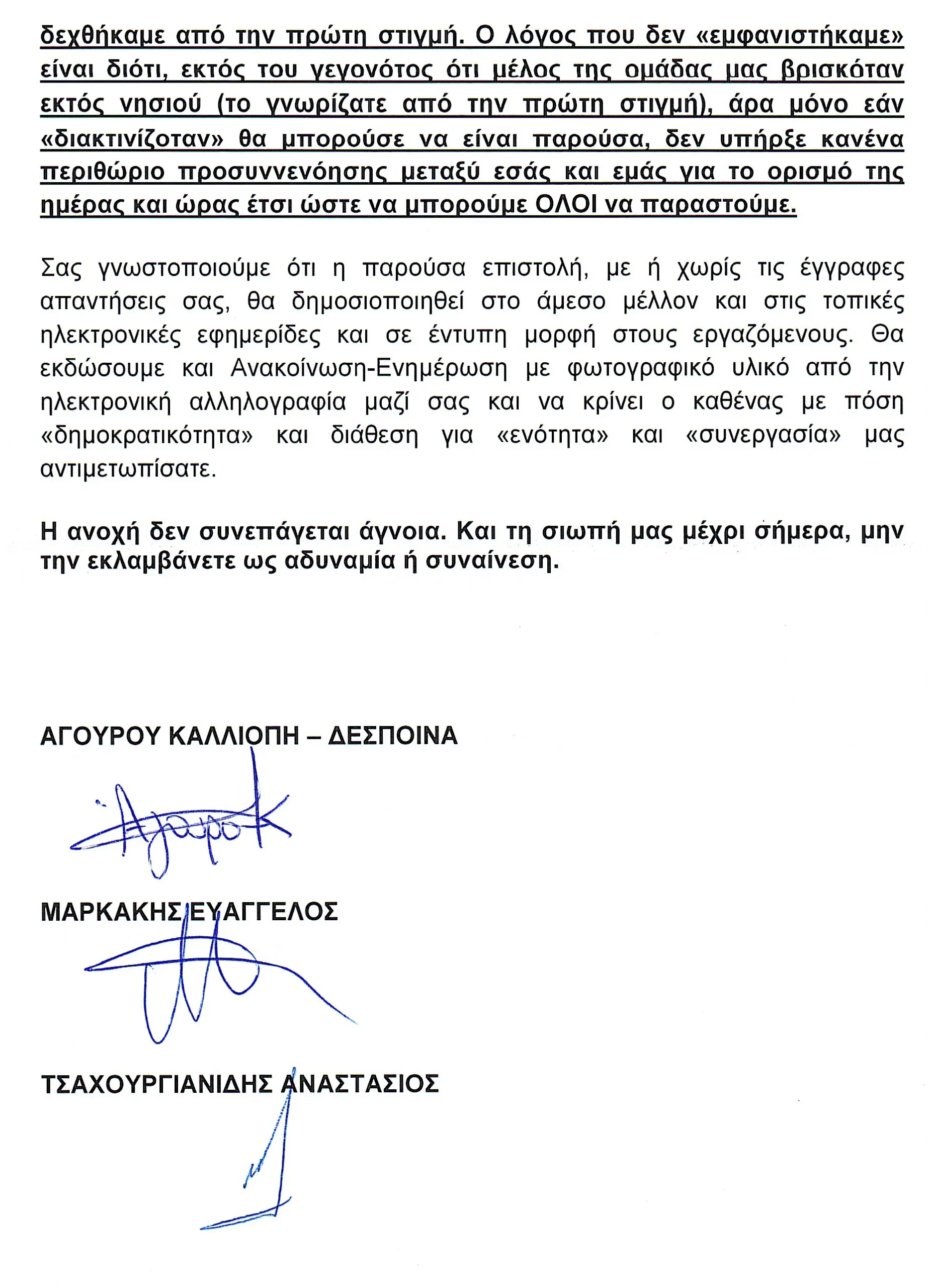 Στη δημοσιότητα δόθηκε η επιστολή - απάντηση της Ενωτικής Κίνησης Εργαζομένων αναφορικά με την πρόσκληση που εξέδωσε ο κ. Μουντάκης για τη Γενική Συνέλευση στις 30 Μαΐου: