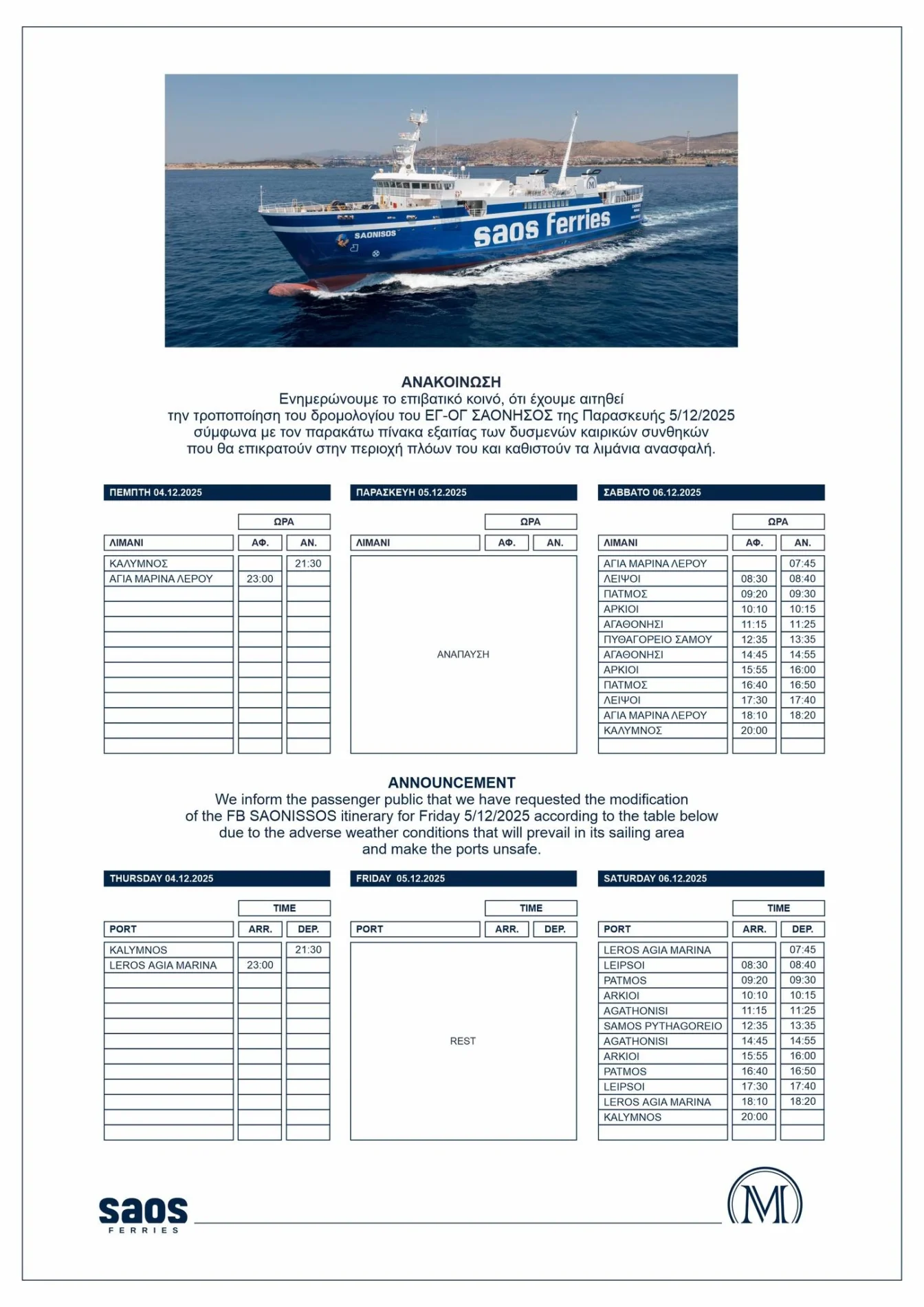 Η SAOS Ferries ενημερώνει το επιβατικό κοινό ότι έχει αιτηθεί την τροποποίηση του δρομολογίου του Ε/Γ-Ο/Γ «ΣΑΟΝΗΣΟΣ», εξαιτίας των δυσμενών καιρικών συνθηκών που αναμένεται να επικρατήσουν στην περιοχή, καθιστώντας τα λιμάνια μη ασφαλή για προσέγγιση.